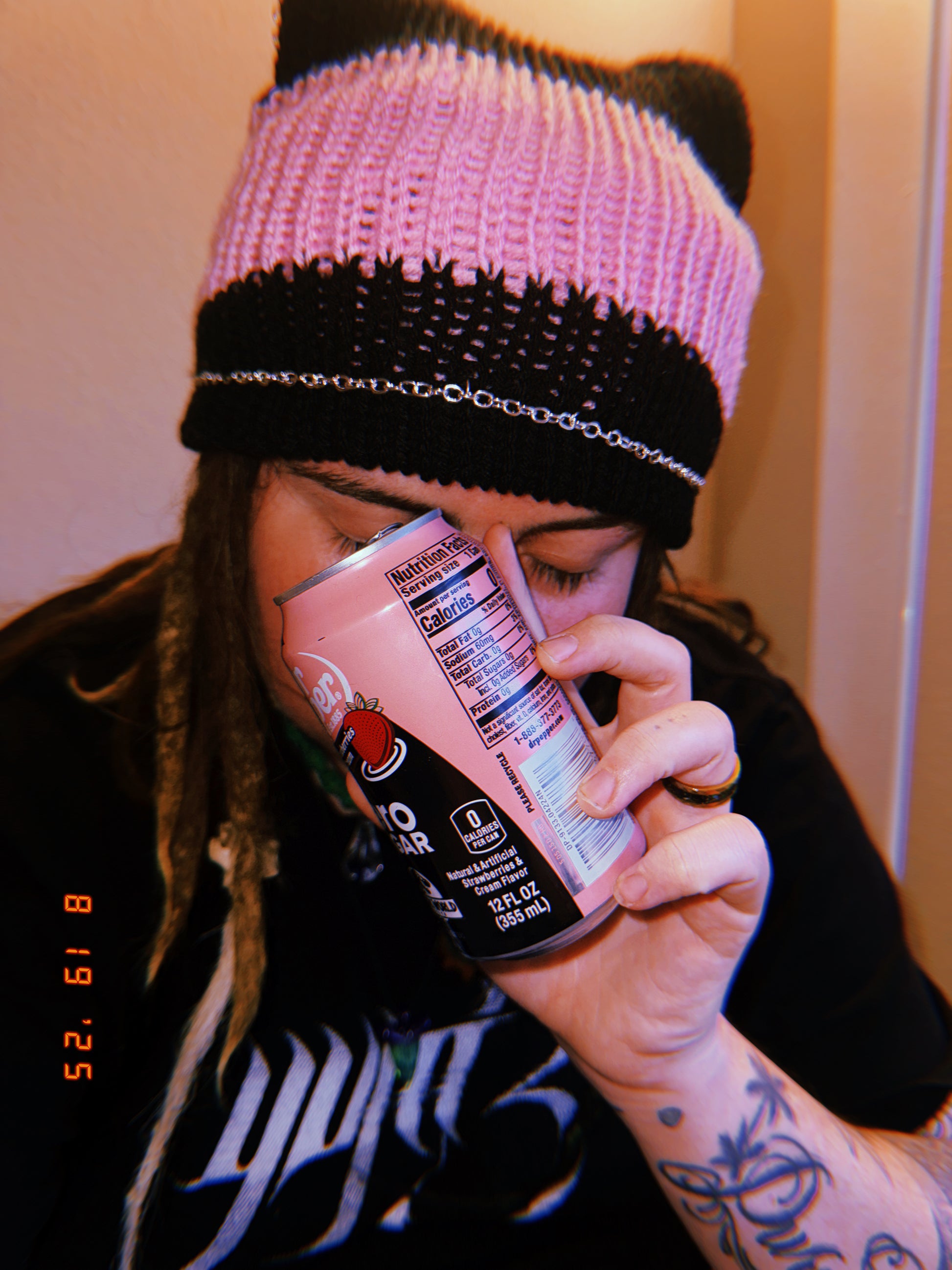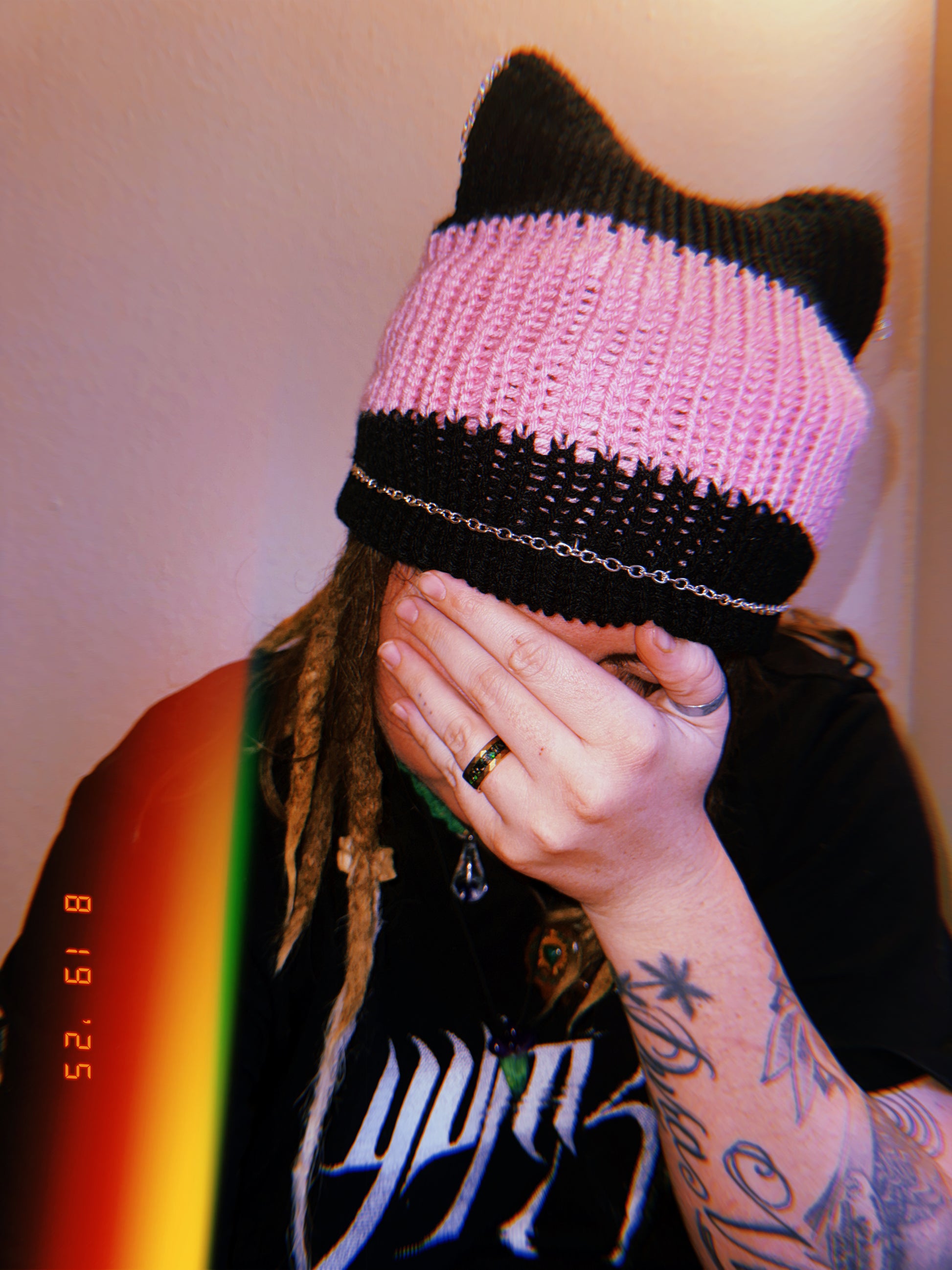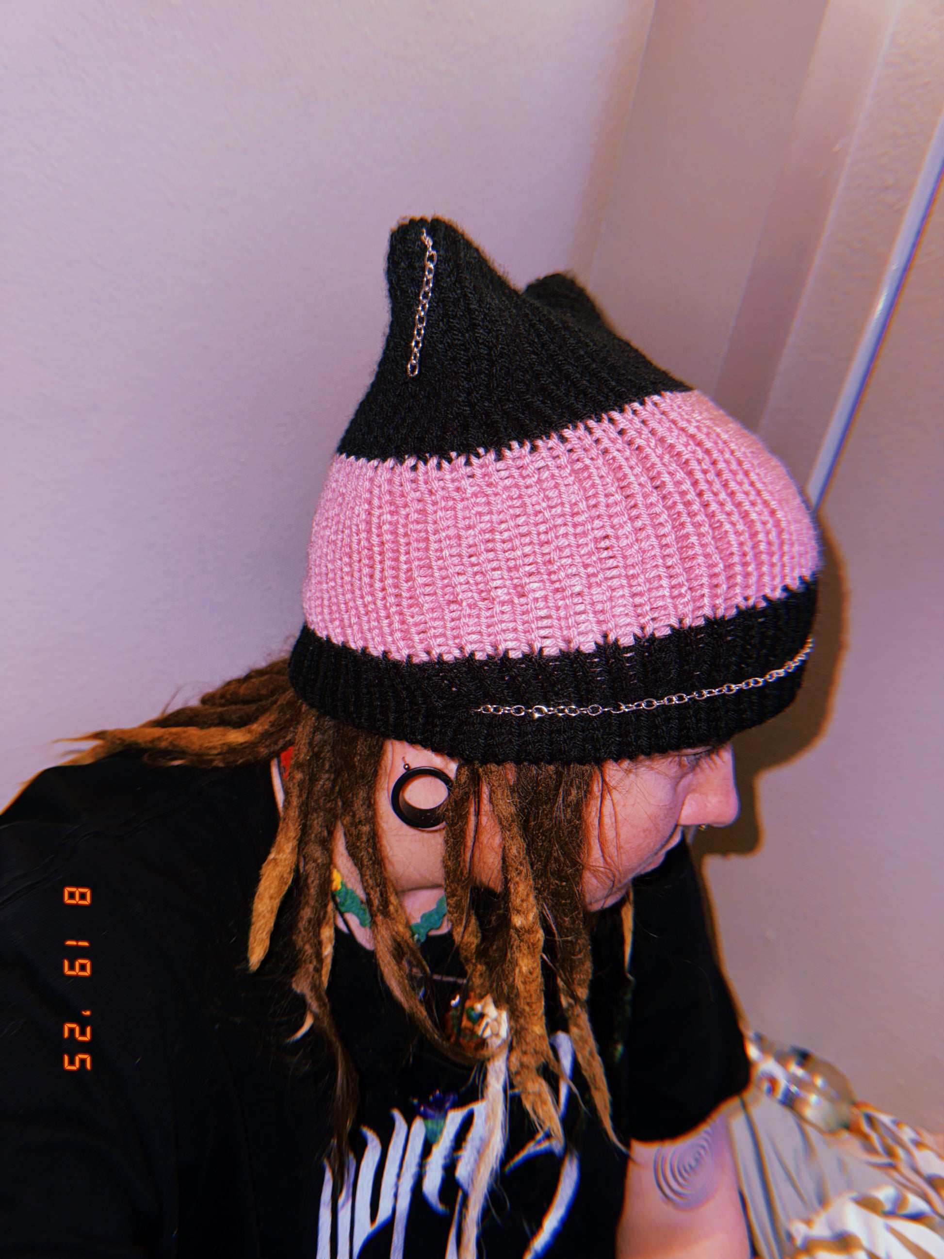 Knotted pink and black cat ear beanie with chains, fits large heads too!
